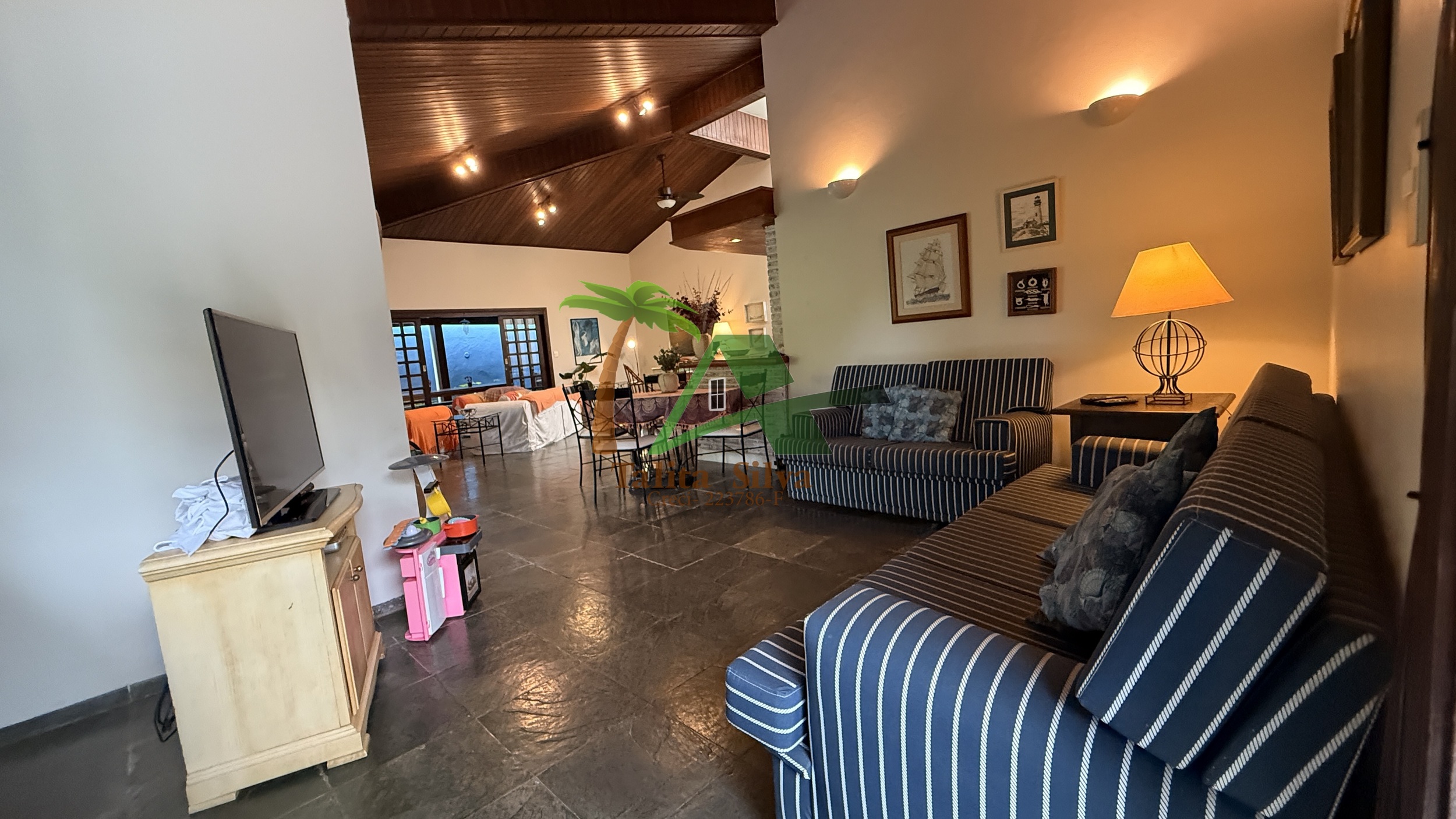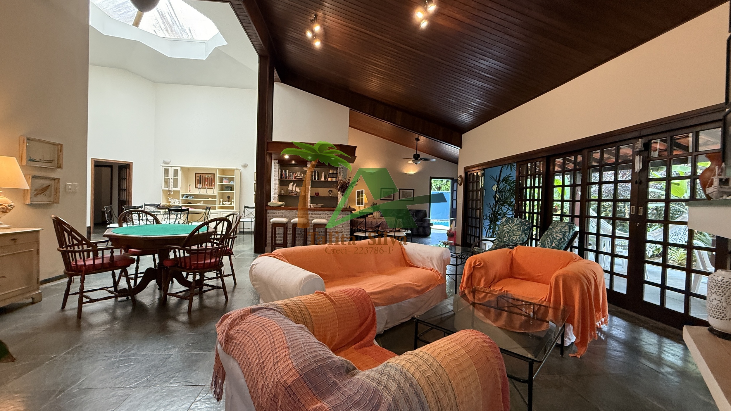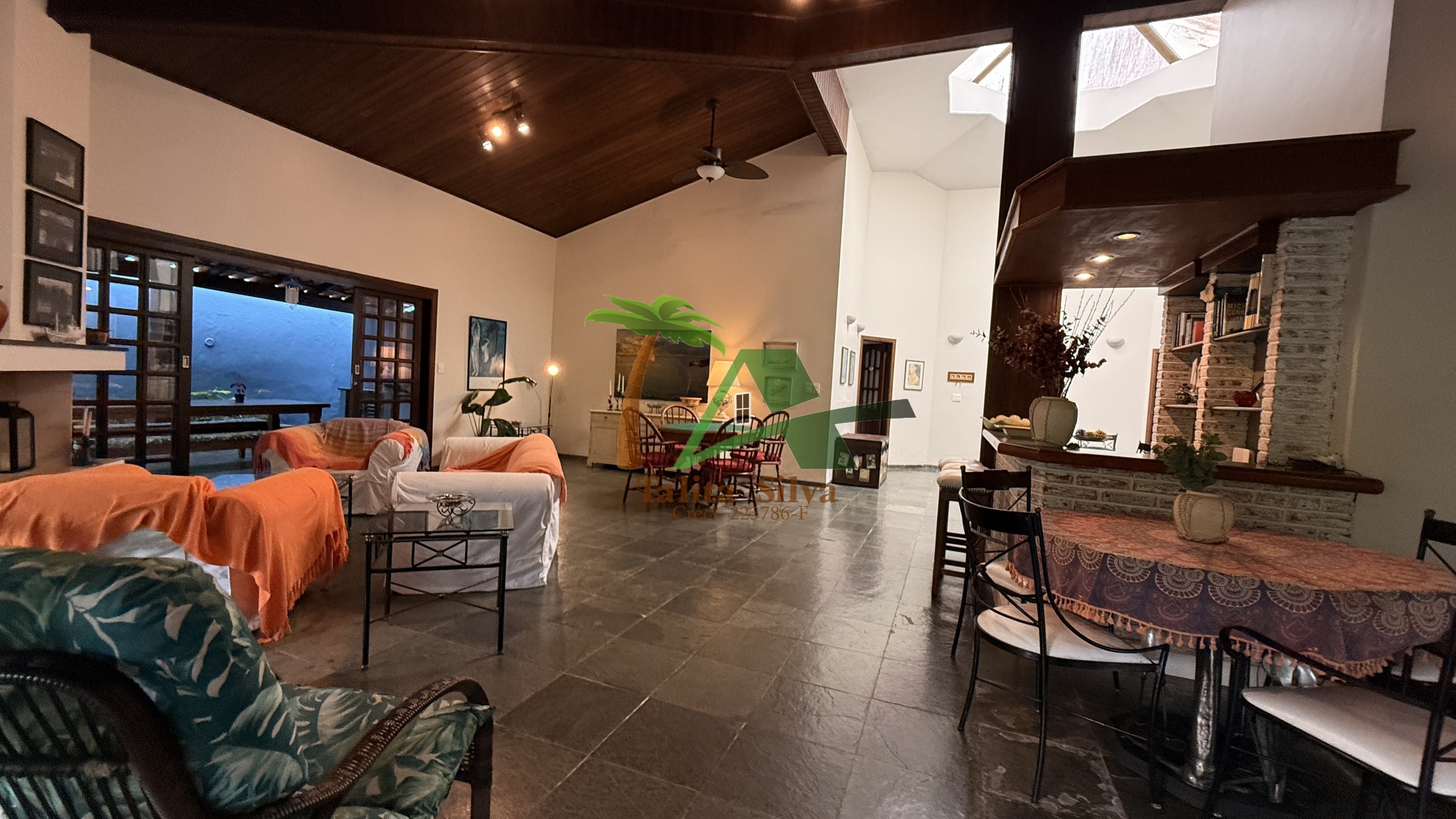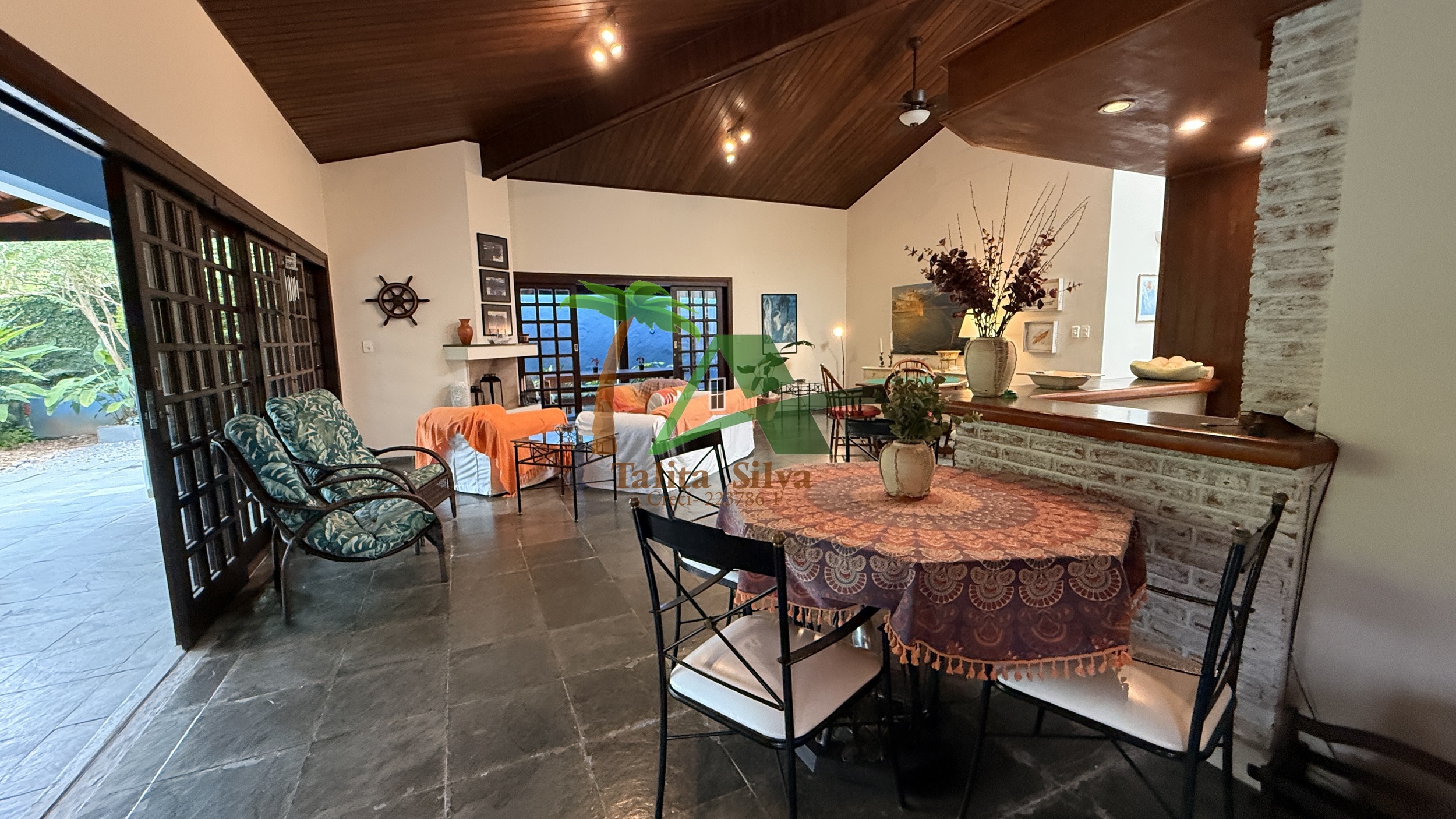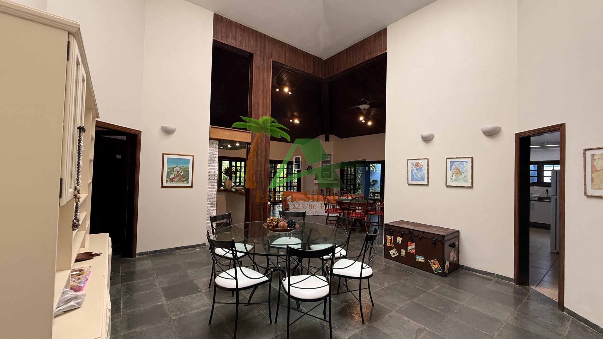 A sala é ampla, com aproximadamente 5 ambientes, criando diferentes espaços de convivência e integração dentro da casa.