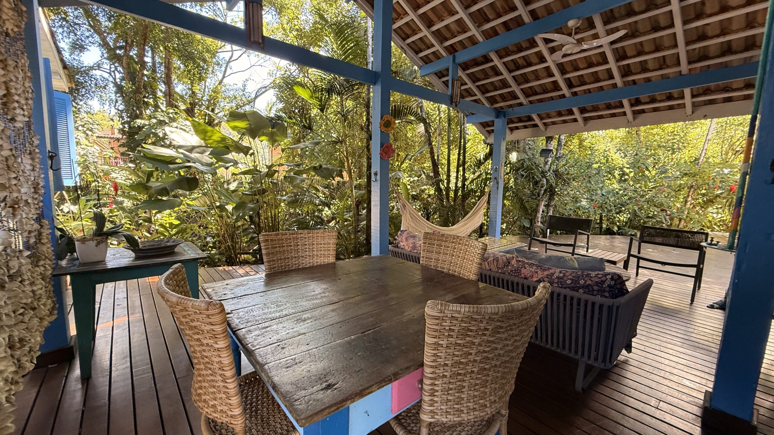 A casa é muito aconchegante, bem estilo praia, com uma área rodeada por muito verde!